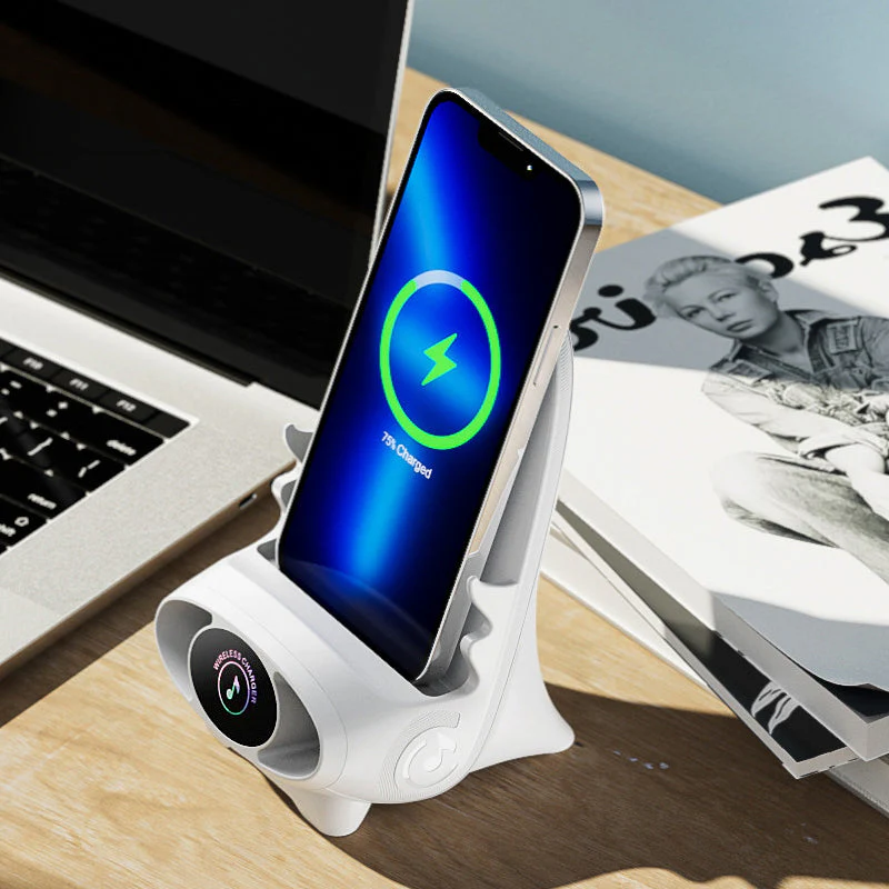 - Unique and novel, the wireless charging/mobile phone holder function can be placed horizontally or vertically, and there is a sound hole at the bottom to make the sound more three-dimensional when the phone is playing.